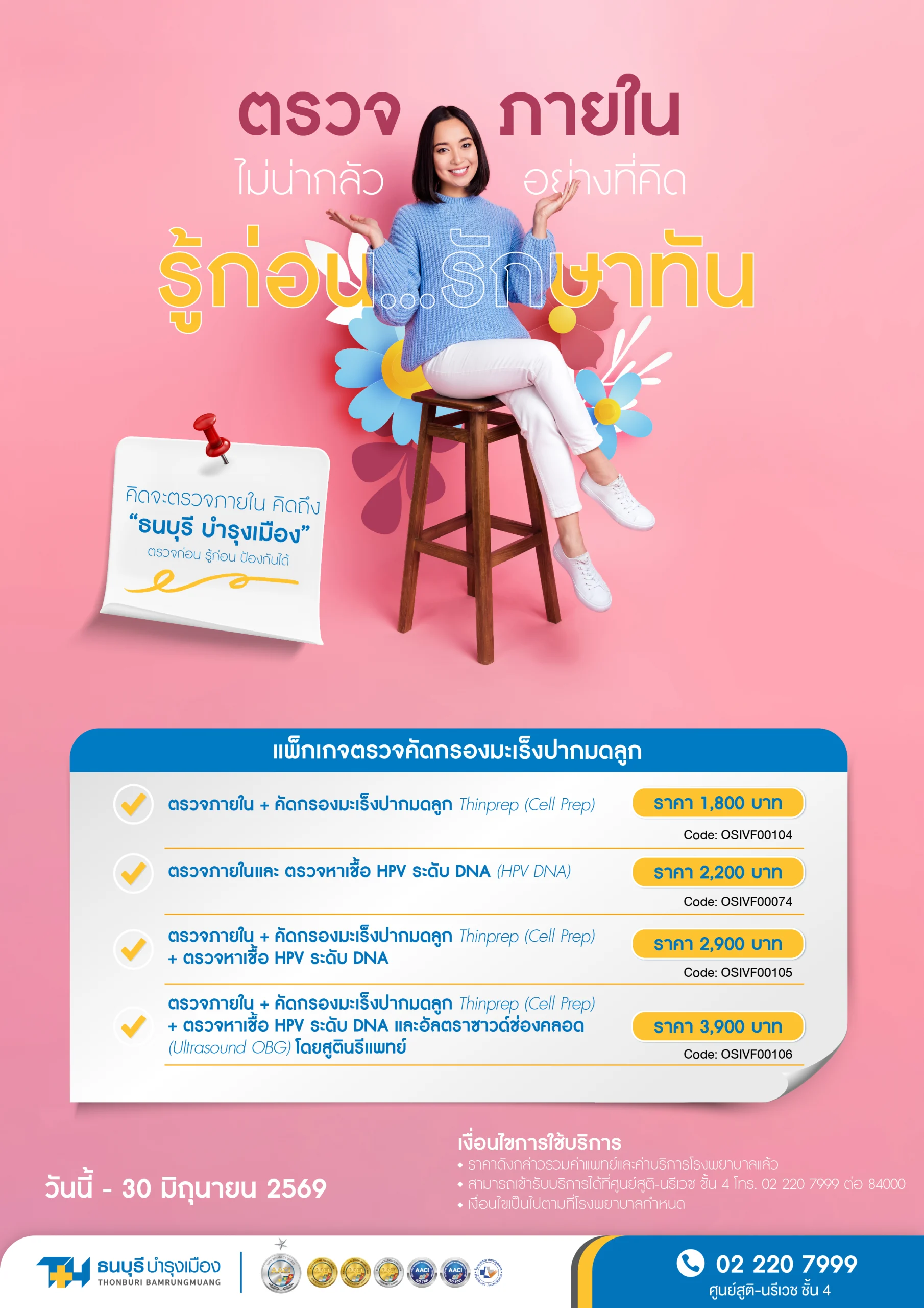 - Internal examination + cervical cancer screening + HPV DNA test + transvaginal ultrasound by an obstetrician-gynecologist – 3,900 THB